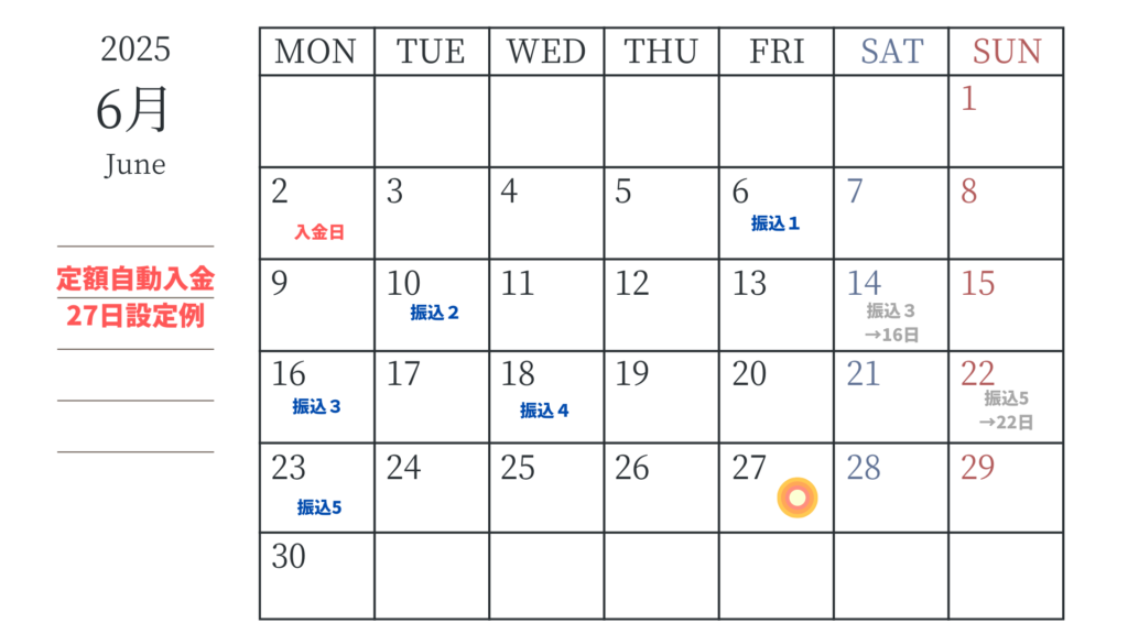「定額自動入金」を毎月27日に設定した場合のスケジュールを紹介します。