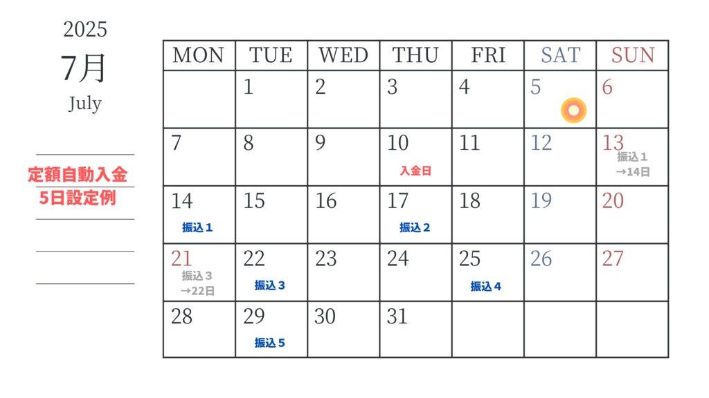 「定額自動入金」を毎月5日に設定した場合のスケジュールを紹介します。