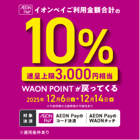 2025年12月6日~12月14日の期間中、AEON Payのスマホ決済(コード決済・WAONタッチ)を利用すると、合計金額の10%分のWAON POINTを進呈。