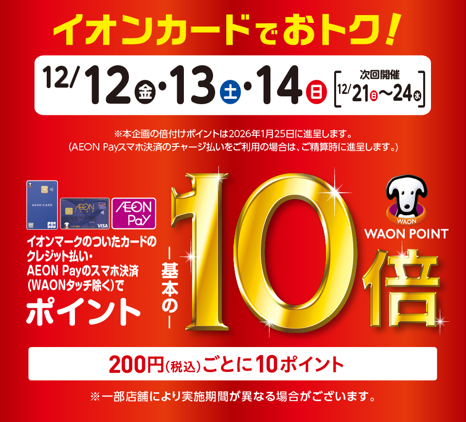 12/21(日)〜24(水)、12/31(水)〜2026 1/2(金)もイオンマークのついたカードのクレジット払い・AEON Payのスマホ決済でWAON POINT10倍を実施します。(詳細は後日)