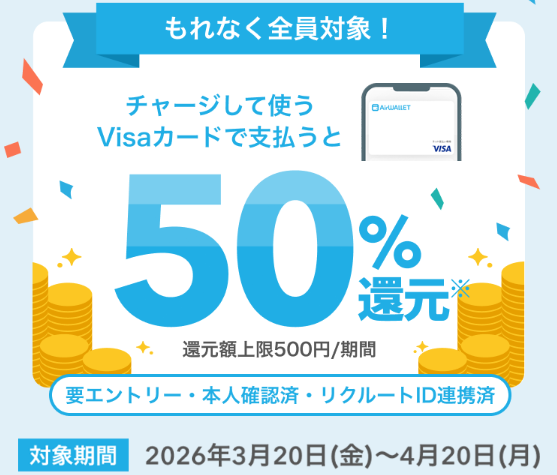 2026年3月20日~2026年4月20日の期間中、エントリーの上エアウォレットのVISAカードで決済すると決済金額の50%のCOIN+残高がプレゼントされます。
