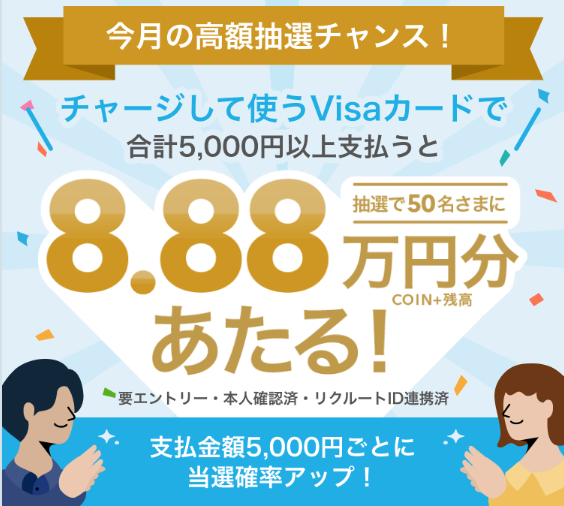 2026年3月20日~2026年4月20日の期間中、エントリーの上、Visaカードで期間中合計5,000円以上支払いした方の中から、抽選で50名さまに8.88万円分のCOIN+残高プレゼントされます。