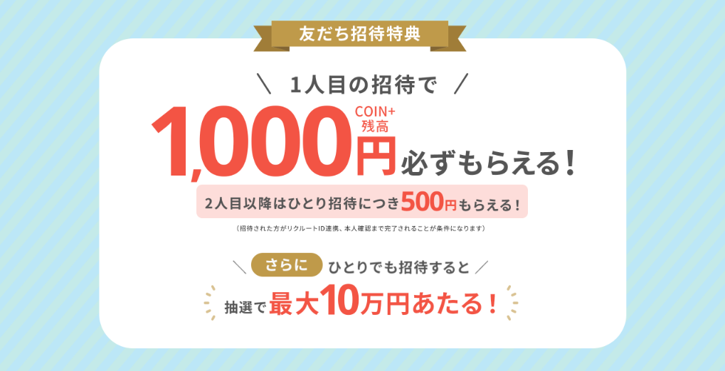 2025年10月1日 ~2025年12月8日の期間中、紹介コードを使ってエアウォレットで新規登録&リクルートID連携&本人確認を完了で500円~1,000円がもらえます。(1人目の招待で1,000円、2人目の招待で500円)