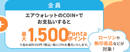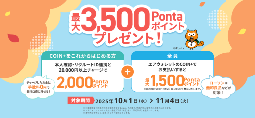 2025年10月1日(水)0:00 ~2025年11月4日(火)23:59の期間中、エントリーの上対象店舗にてエアウォレットアプリのCOIN+で決済すると決済金額の15%のCOIN+残高がプレゼントされます。