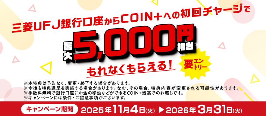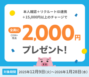 2025年12月9日(火)0:00 ~2026年1月28日(水)23:59の期間中、キャンペーンにエントリーし期間中に以下の条件を満たすと、COIN+残高2,000円をプレゼントされます。