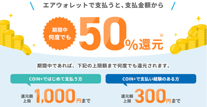 2025年12月9日(火)0:00 ~2026年1月13日(火)23:59の期間中、エントリーの上対象店舗にてエアウォレットアプリのCOIN+で決済すると決済金額の50%のCOIN+残高がプレゼントされます。