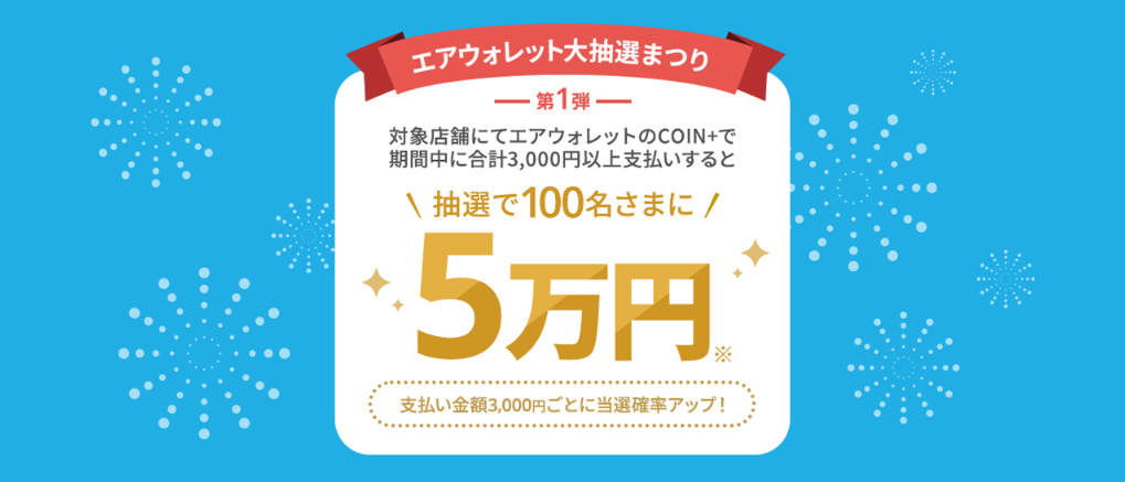 対象店舗にてエアウォレットアプリのCOIN+で合計3,000円(税込)以上決済すると抽選で100名に5万円のCOIN+残高をプレゼント。