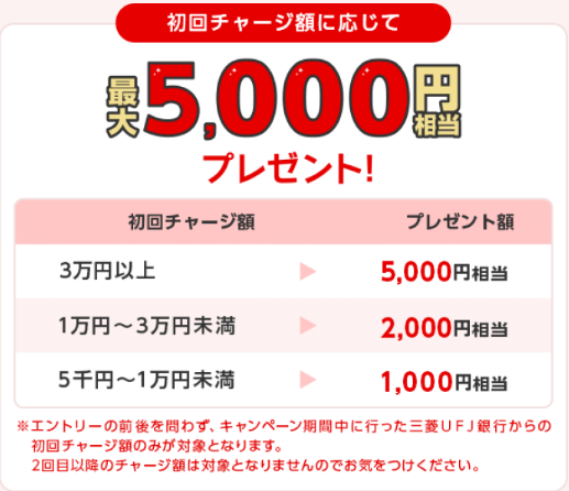 3万円以上チャージで5,000円なのでこれを狙っていきましょう。