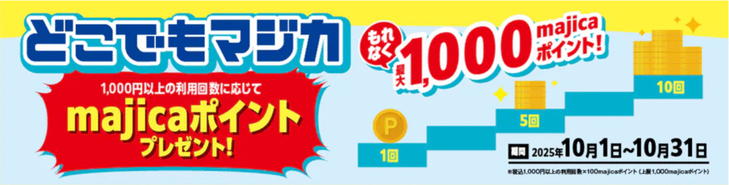 2025年10月1日~10月31日の期間中、エントリーボタンからエントリーのうえ、ドン・キホーテ系列店舗、アピタ、ピアゴ、ユーストア、テナント・専門店等majica加盟店以外のお店でどこでもマジカを1,000円(税込)以上利用すると100majicaポイントを、最大10回の利用分まで(1,000majicaポイント)進呈。
