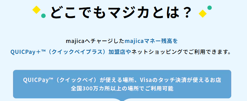 どこでもマジカとは、majicaへチャージしたmajicaマネー残高をQUICPay+™(クイックペイプラス)加盟店・VISA加盟店やネットショッピングで利用できるサービスです。
