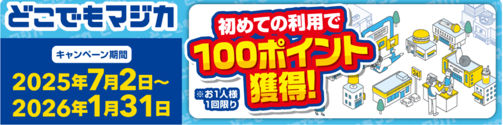 2025年7月2日~2026年1月31日の期間中、どこでもマジカを初めて利用(税込500円以上)すると、100ポイントがもらえるキャンペーンです。