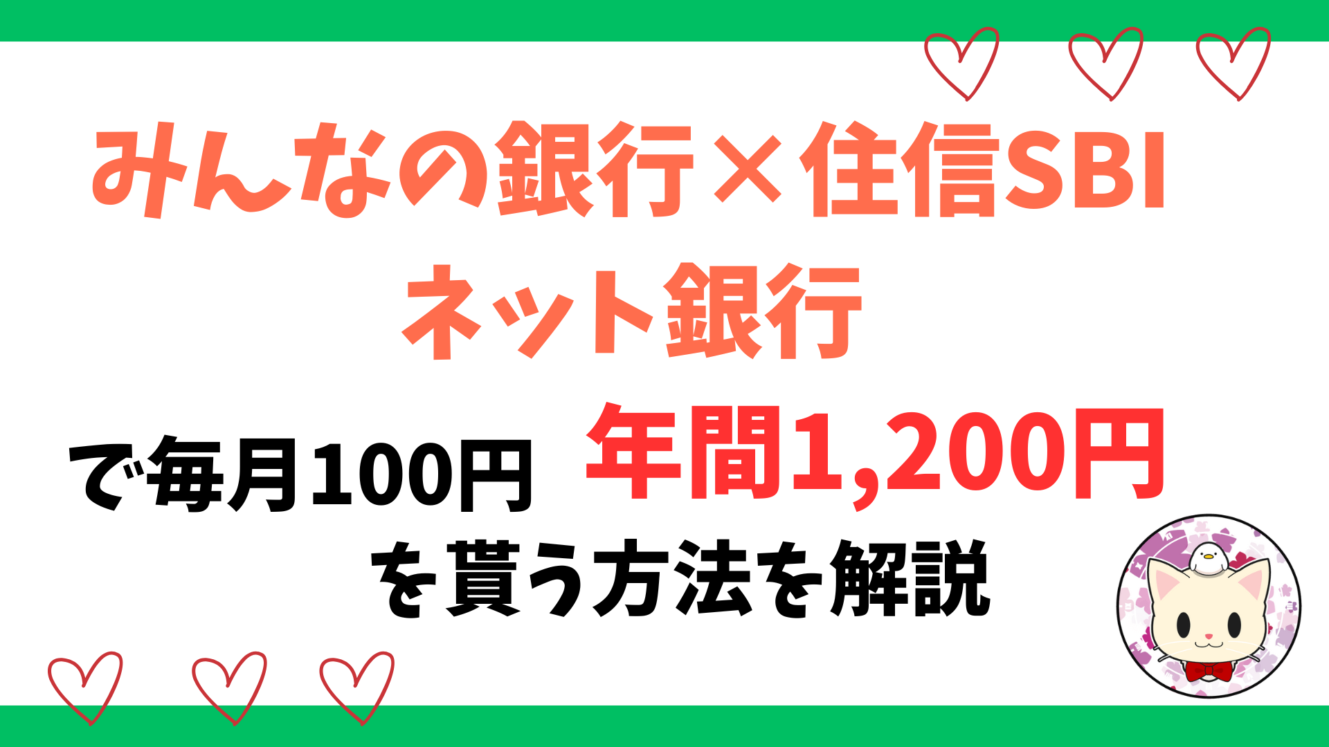 この記事は、「みんなの銀行」と「住信SBIネット銀行」を使って、毎月100円、年間1,200円を貰う方法を解説します。
