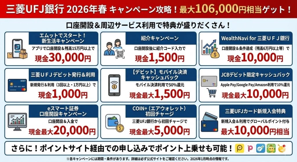 2026年春の三菱UFJ銀行の新規口座開設キャンペーンについて解説しました。