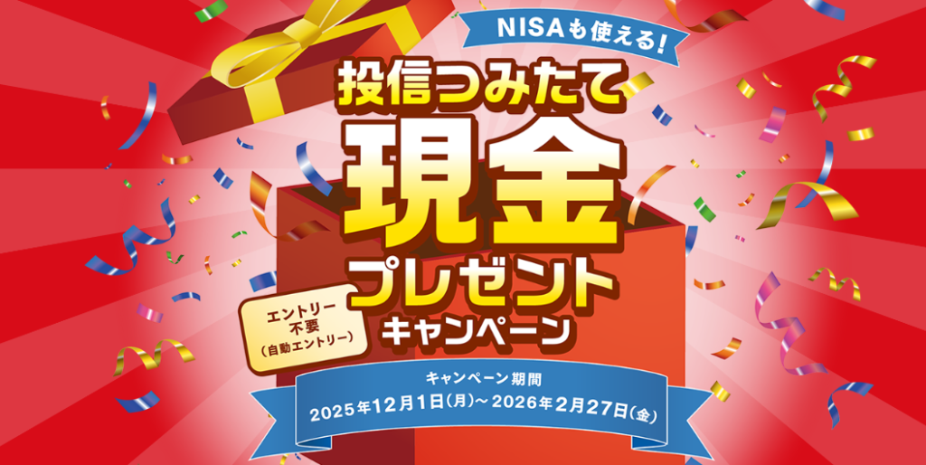 2025年12月1日~2026年2月27日の期間内に対象商品の投信つみたて(継続購入プラン)を新規で契約し、2026年3月3日までに契約とともに1回あたり3万円以上の振替(購入時手数料と消費税を含む金額)をすると現金2,000円がプレゼントされます。