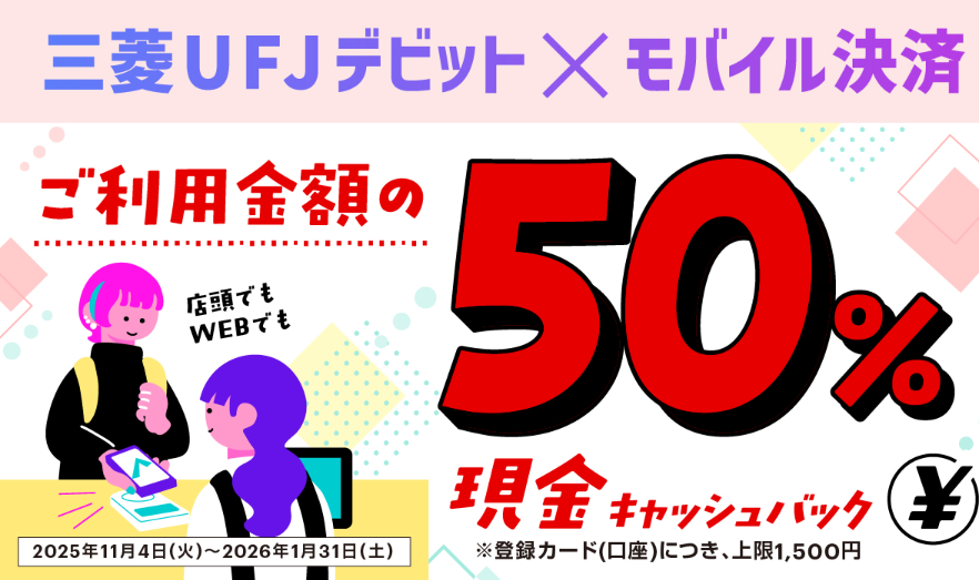 | (5)【三菱UFJデビット】 モバイル決済利用で50%キャッシュバック | 1,500円 | 2025年11月4日~2026年1月31日 |