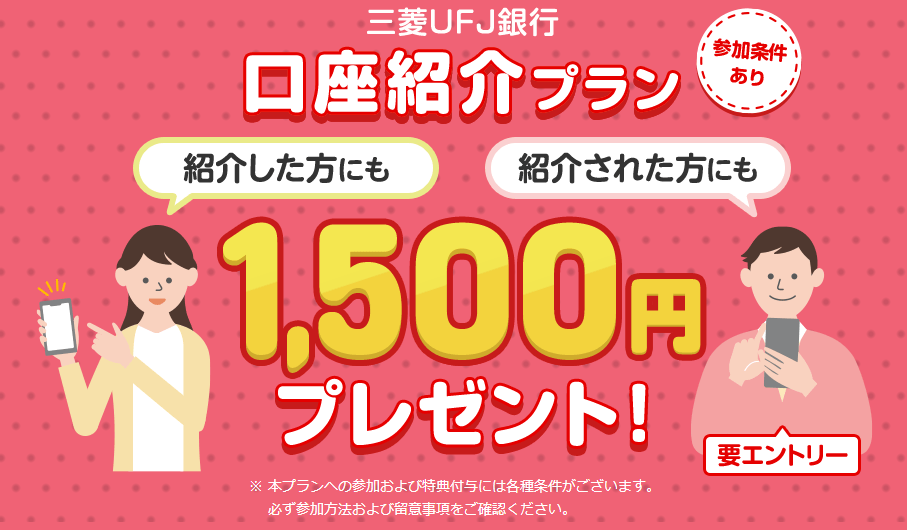 三菱UFJ銀行の口座を開設した翌月末までに紹介コードを入力すると1,500円がもらえます。