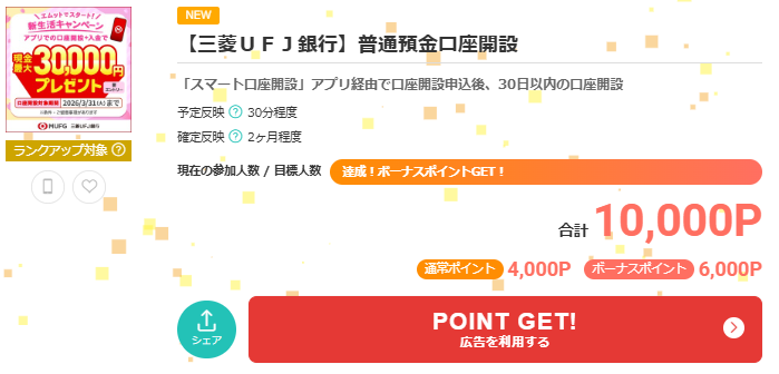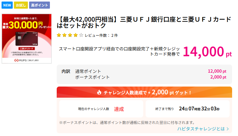ポイントサイトでは執筆時点で三菱UFJ銀行の新規口座開設と三菱UFJカードの発行を合わせて14,000ポイントがありました。
