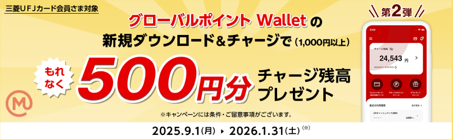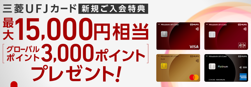 三菱UFJカードの入会日から2ヵ月後末日までのショッピング利用金額合計額に応じてグローバルポイントがプレゼントされます。