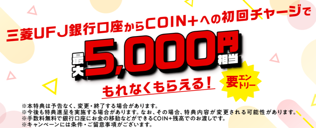対象は、エアウォレットアプリおよびCOIN+アカウントをお持ちの方で過去に三菱UFJ銀行口座からの残高チャージをしたことがない人です。