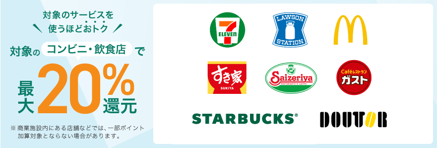| 対象店舗でのポイントアップ | 最大20% |