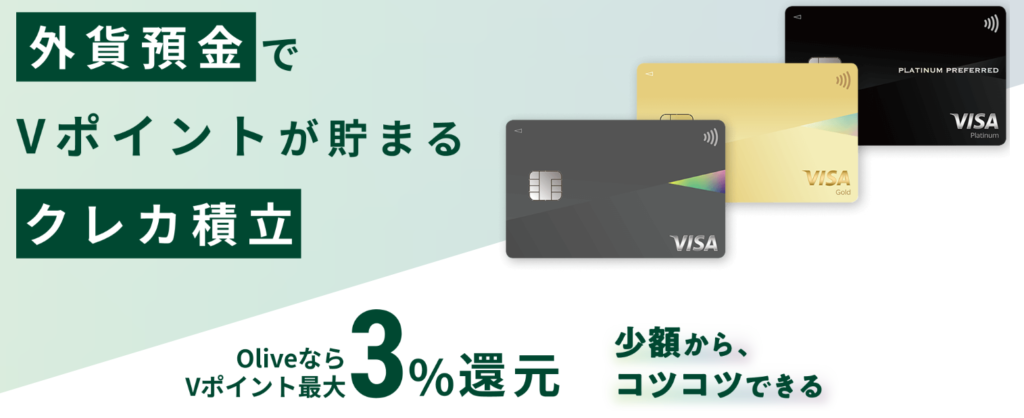 三井住友銀行のOlive口座では、毎月の外貨積立を対象のクレジットカード決済で行う「外貨クレカ積立」ができるようになりました。積立金額の0.5~3%のVポイントが貯まります。