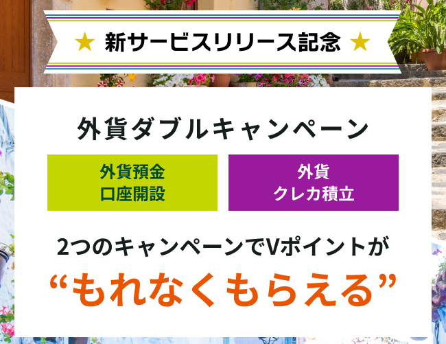 2026/1/19~2026/4/17 23:59の期間にエントリーと対象取引達成の上、2026年6月30日(火)15時 時点の外貨預金残高に応じてVポイントがもらえます。