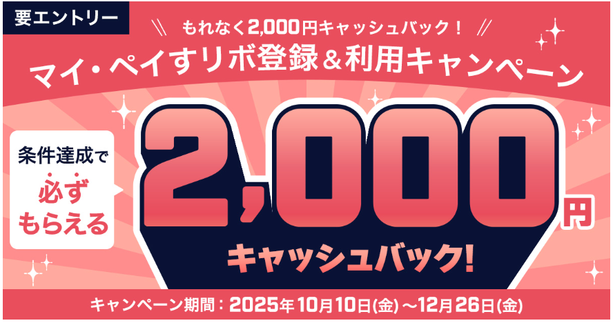 もれなく2,000円キャッシュバック!マイ・ペイすリボ登録&利用キャンペーンとは、2025年10月10日~12月26日の期間中に開催されている三井住友カードのリボキャンペーンです。