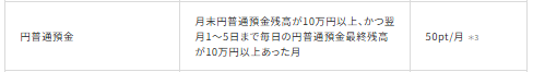 Vネオバンクでは月末円普通預金残高が10万円以上、かつ翌月1~5日まで毎日の円普通預金最終残高が10万円以上あると50ポイントがもらえます。