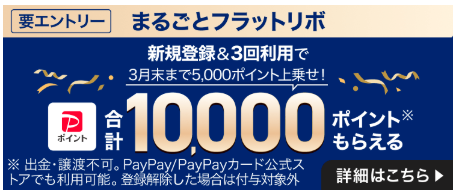 まるごとフラットリボを登録した月から3か月後の末日頃にPayPayポイント5,000ポイントが付与されます。