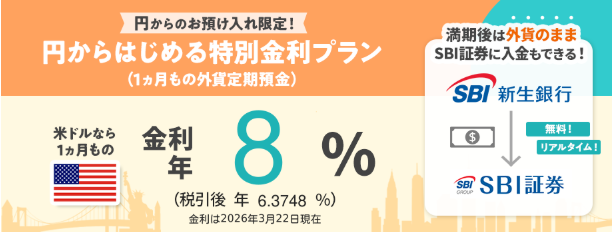 円から外貨定期預金の設定にもし取り組むなら、「円からはじめる特別金利プラン(1ヵ月もの外貨定期預金)」がよさそうです。例えば2026年3月時点では米ドル1カ月もの金利年8%となっています。