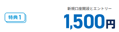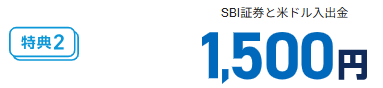 口座開設月を含む3ヵ月目の末日までにSBI証券との外貨入出金サービスの利用で、1回1,000ドル以上の入金もしくは出金をすると1,500円がもらえます。