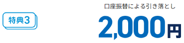 口座開設月を含む3ヵ月目の末日までに。「1回1万円以上」の口座振替による引き落としが一度でも実行されていた場合に2,000円がもらえます。